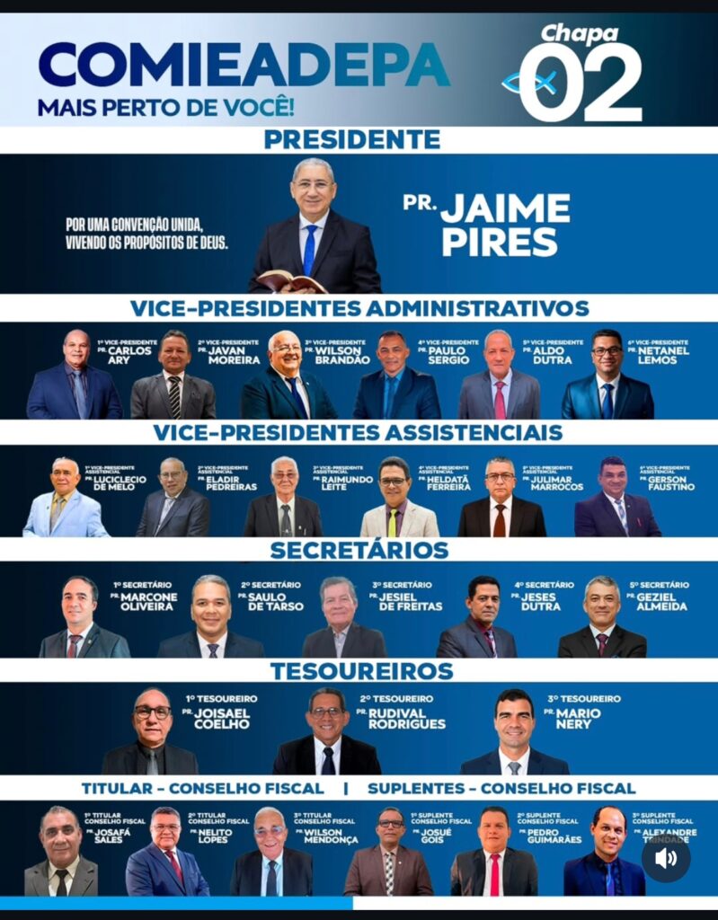 A Chapa 02 reforçou que não é um projeto individual. O grupo é composto por uma extensa lista de lideranças experientes, incluindo vice-presidentes administrativos como o Pr. Carlos Ary e o Pr. Javan Moreira, além de uma equipe completa de vice-presidentes assistenciais, secretários, tesoureiros e conselho fiscal.